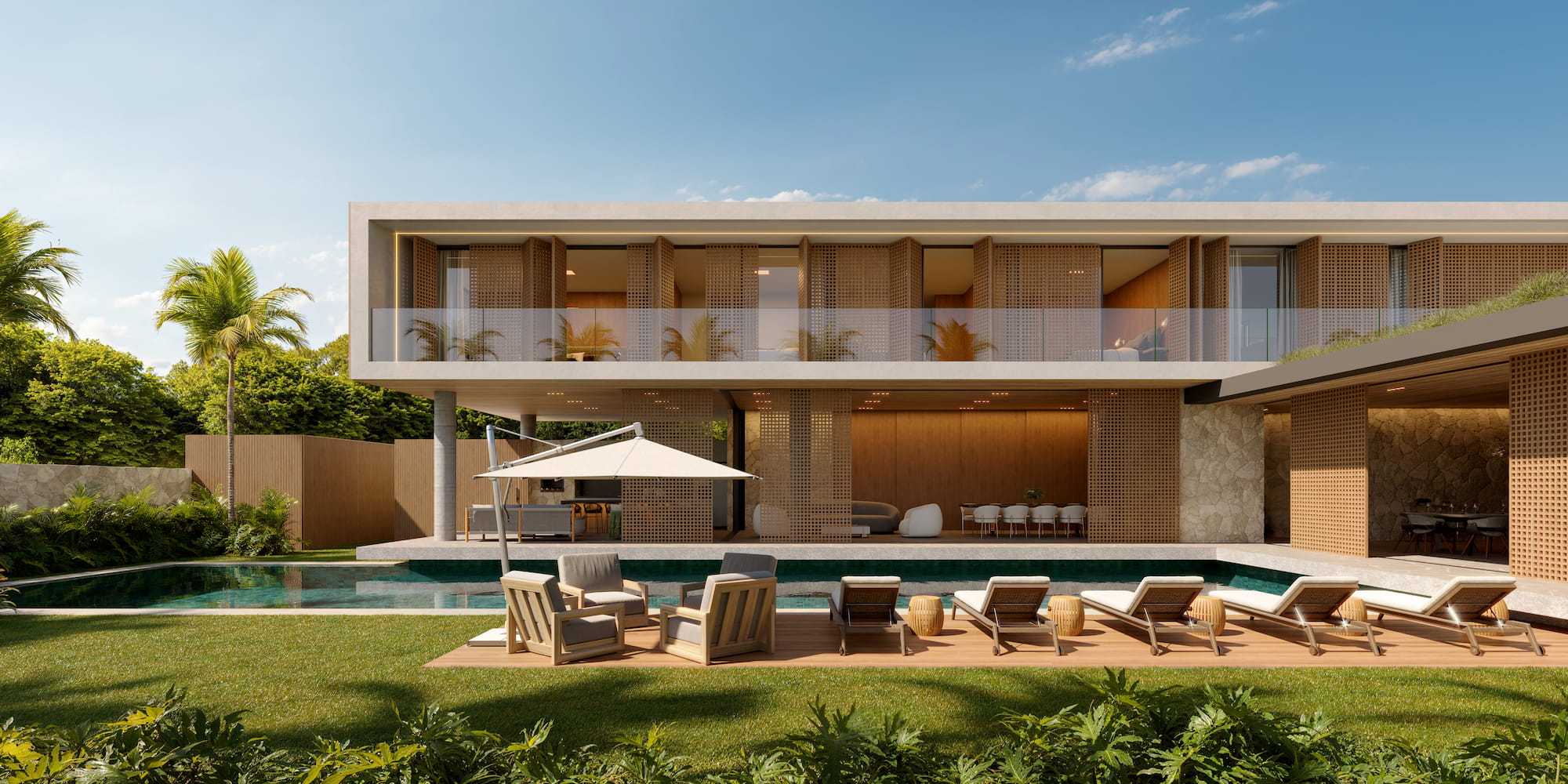 A materialidade valoriza elementos naturais como pedra moledo, madeira, concreto aparente e amplos planos de vidro, promovendo conexão direta com a área da piscina e com o paisagismo. A fachada ripada funciona como filtro visual e climático, permitindo ventilação cruzada e controle de insolação, complementada por uma segunda camada em vidro. O mesmo elemento camufla a área técnica e a sauna, preservando a unidade formal do conjunto.